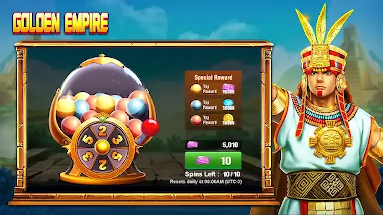 Joining the Golden Empire game will take players on a mysterious journey, exploring the Sun Temple and hunting for the secret golden treasure. Players must pass the levels and open the hidden doors to discover the exciting and surprising things behind them. In the process, they have the opportunity to receive many valuable rewards.